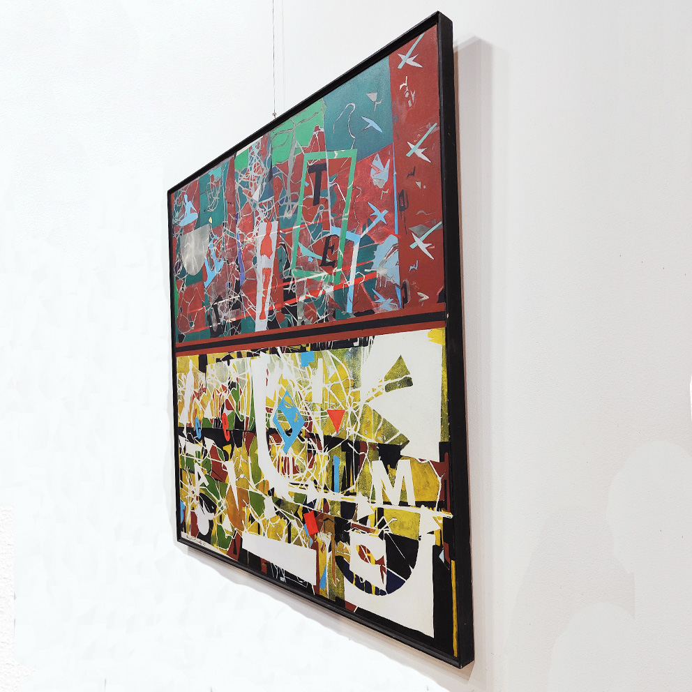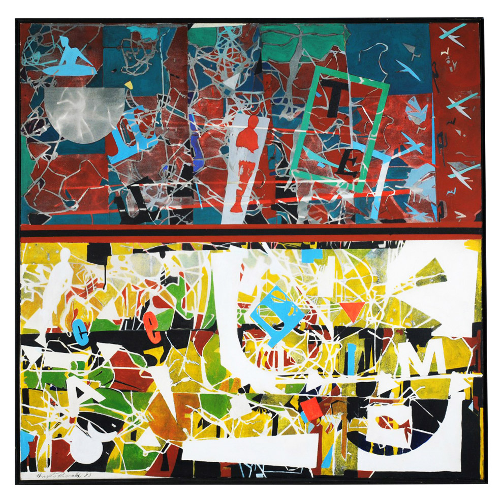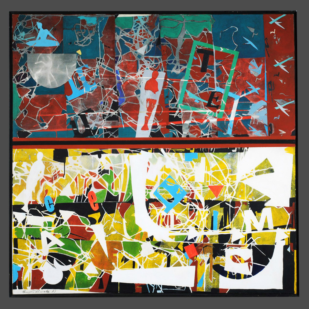 Angelo Rinaldi, scena di vita, tecnica mista su tela, cm.104x104, anno 1993